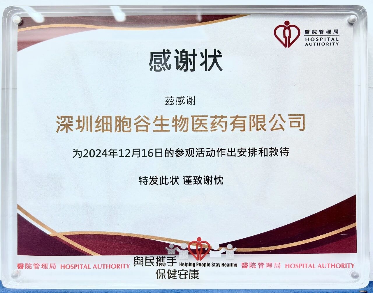 Presenting a Letter of Appreciation to Hong Kong Hospital Authority