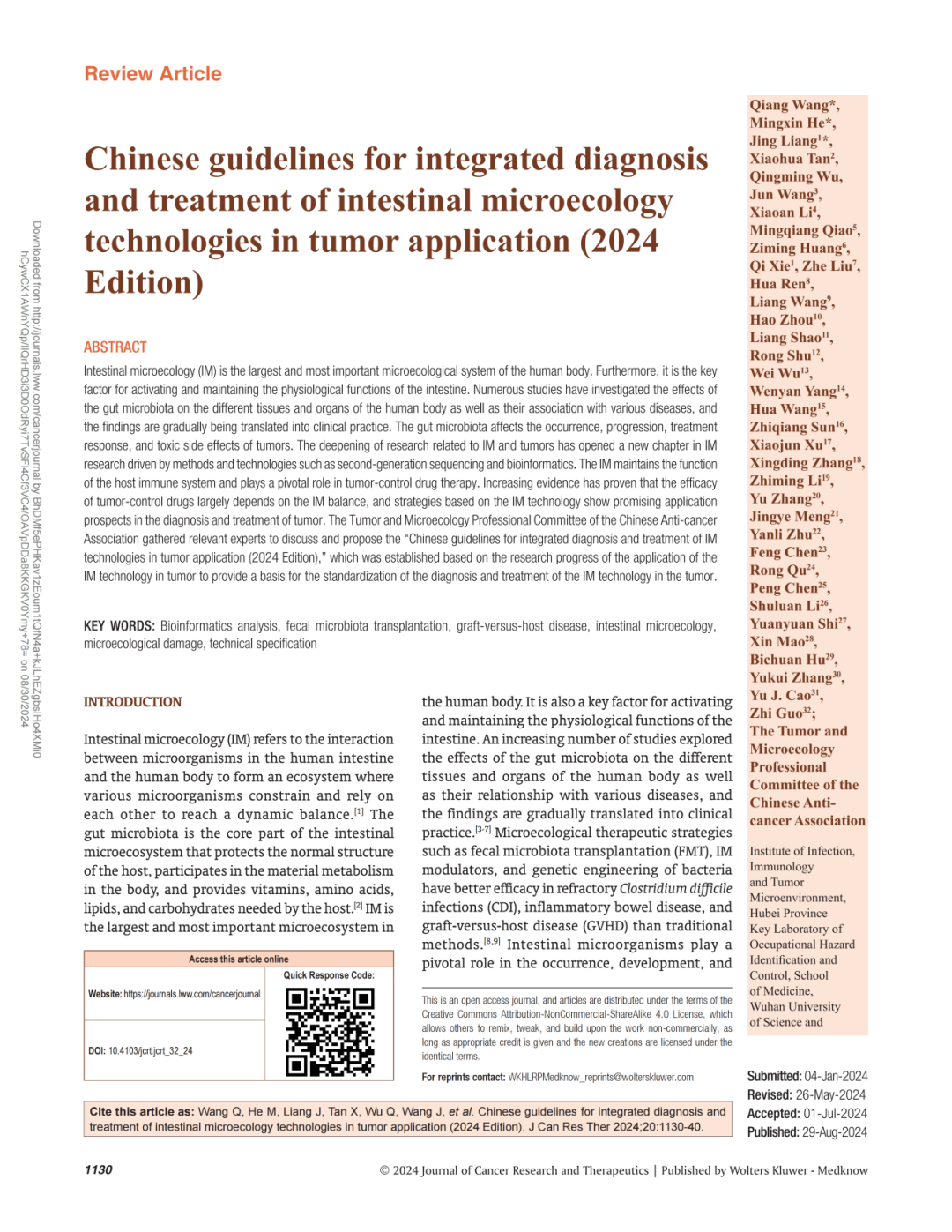 近日,中国抗癌协会肿瘤与微生态专业委员会组织相关专家共同讨论,由华中科技大学协和深圳医院郭智主任和武汉科技大学医学部王强教授牵头制定《中国肿瘤应用肠道微生态技术综合诊疗指南(2024年版)》,我司董事长史渊源教授参与该指南制定,该指南根据肠道微生态技术在肿瘤中应用的研究进展而制定,为肠道微生态技术在瘤体内的诊断和治疗标准化提供依据。