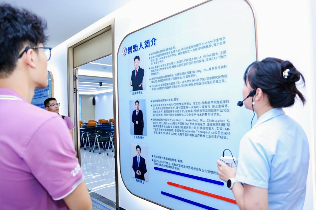 在王露主任细致引介下,同学们参观了智慧展厅,对深圳细胞谷的战略定位、核心技术、创始团队、历史沿革、企业文化、产业地位、产品管线、专利荣誉等有了全面而深入的了解。其中,作为全国生物技术行业产教融合共同体常务理事单位、深圳市生物医药产教联盟副理事长单位,深圳细胞谷一直致力于为细胞与基因治疗各相关企业及机构提供对人才的理论知识、实操技术的相关培训,培养具备GMP工业化生产技能的生产人员及细胞与基因治疗领域专业人才,促进生物医药行业高质量发展。