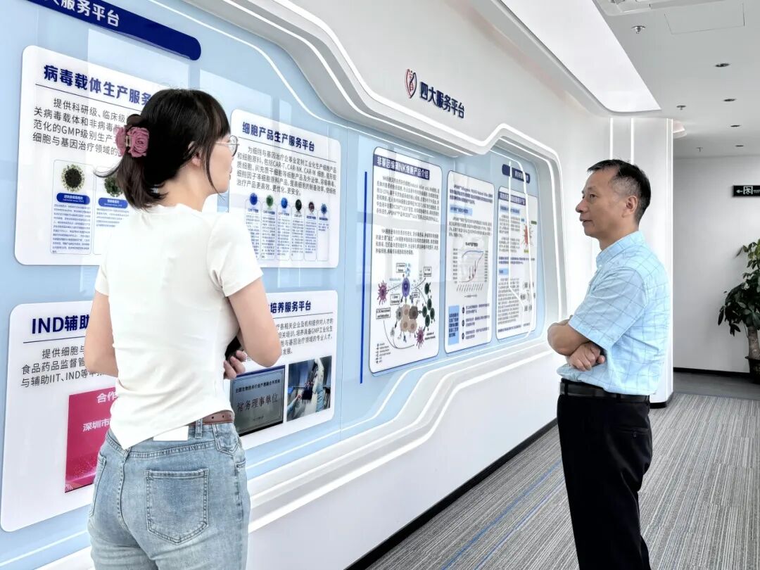 来访领导一行先是在综合办公室主任王露和研发科学家杨轶晴的详细引介下,进一步了解了深圳细胞谷的战略定位、创始团队、企业愿景、发展历程、核心技术优势以及四大服务平台。