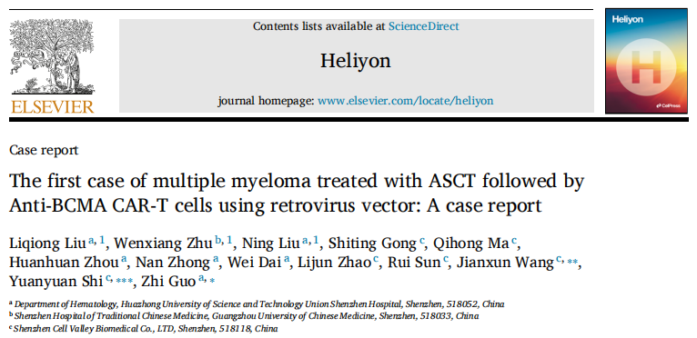国际首例!深圳细胞谷联合华中科技大学协和深圳医院血液内科郭智主任团队于2024年8月26日在Cell旗下的多学科JCR1区期刊《Heliyon》上发表了题为“The first case of multiple myeloma treated with ASCT followed by Anti-BCMA CAR-T cells using retrovirus vector: A case report“的案例报告。本案例报告共同通讯作者为华中科技大学协和深圳医院血液内科郭智教授和我司董事长史渊源教授、首席科学家王建勋教授,共同第一作者为刘黎琼副主任医师、朱文翔博士和刘宁副主任医师。这是国际上首次应用逆转录病毒载体制备的针对BCMA靶点CAR一T临床治愈晚期复发难治多发性骨髓瘤的案例报道,也是从基础研究到临床转化的经典成功案例。基于逆转录病毒载体制备的临床级细胞产品具有产能高、成本低、转染和体内扩增效果好等优势,本次临床研究的成功为晚期血液肿瘤患者提供了质高价廉的细胞治疗产品的选择,为细胞治疗产品规模化、工业化应用提供了极具前景的探索。