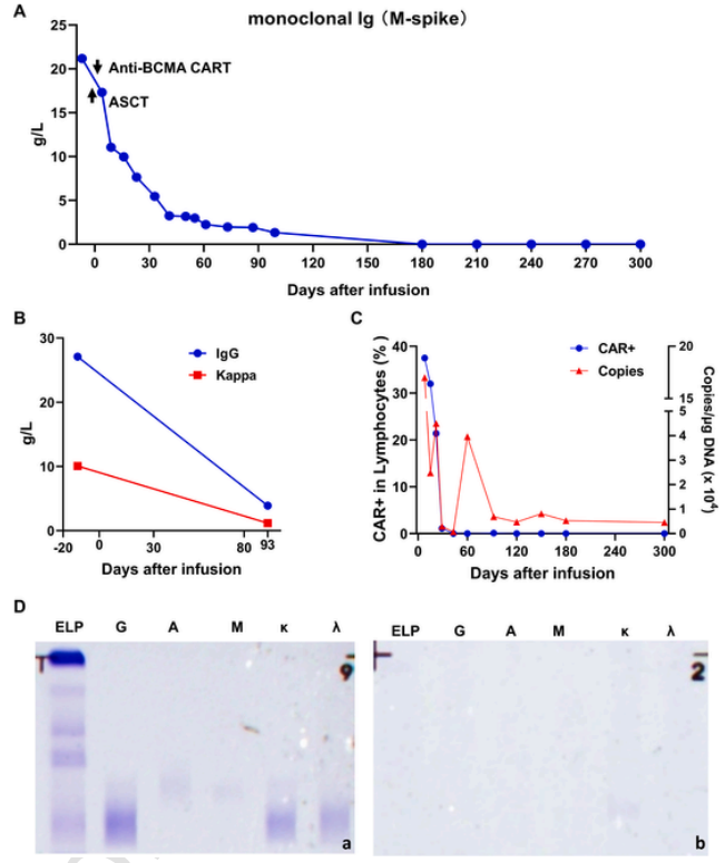 图5 输注CAR-T后的关键指标水平。(A)输注后检测M蛋白的水平。(B)输注后IgG和Kappa的变化。(C)输注CAR-T后CAR-T细胞扩增水平与CAR-DNA拷贝水平。(D)血清和尿液中 IgG和Kappa均为阴性。