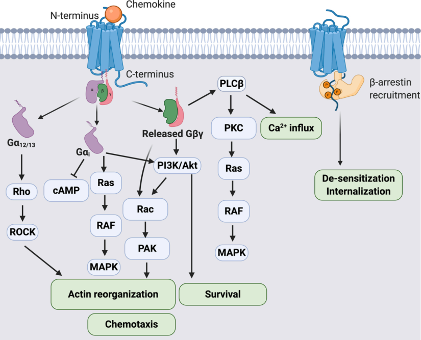 趋化因子受体是具有配体结合N端和7个跨膜结构域的G蛋白偶联受体(GPCRs)。一旦与相应的趋化因子配体结合,细胞内的G蛋白构象就会发生变化,与受体分离,导致Gα-ATP复合物和Gβγ异源二聚体的释放,如图2所示。大多数趋化因子受体与Gαi亚基偶联,但也可以通过其他Gα蛋白发出信号,如Gα12/13、Gαs和Gαq。一旦被激活,Gαi亚基可以抑制cAMP的产生,诱导Ras/RAF/MAPK信号通路,以及PI3K/Akt通路。细胞迁移的主要调控因子是释放的Gβγ异源二聚体,它不仅激活PI3K/Akt通路控制肌动蛋白重组,还通过PLC调控Ca2+动员和MAPK信号传导。Gβγ异源二聚体也参与了β-抑制素的募集,这对趋化因子受体的脱敏和内化至关重要。