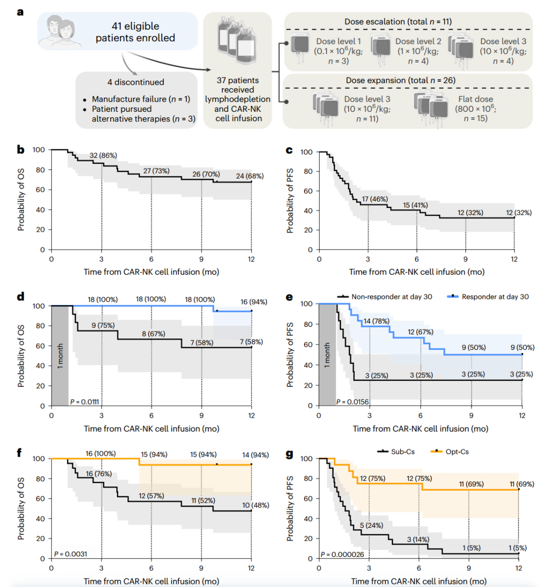 该临床试验的主要目标是安全性和有效性评估,定义为治疗第30天时的总缓解率(OR),次要目标包括第100天时的总缓解率、无进展生存期(PFS)、总生存期(OS)和CAR19/IL-15 NK细胞的持久性。结果显示,患者没有出现严重细胞因子释放综合征、神经毒性或移植物抗宿主病。第30天和第100天的OR率均为48.6%。一年总生存率和无进展生存率分别为68%和32%,获得OR的患者有更高水平的CAR-NK细胞数量和更长的持久性。