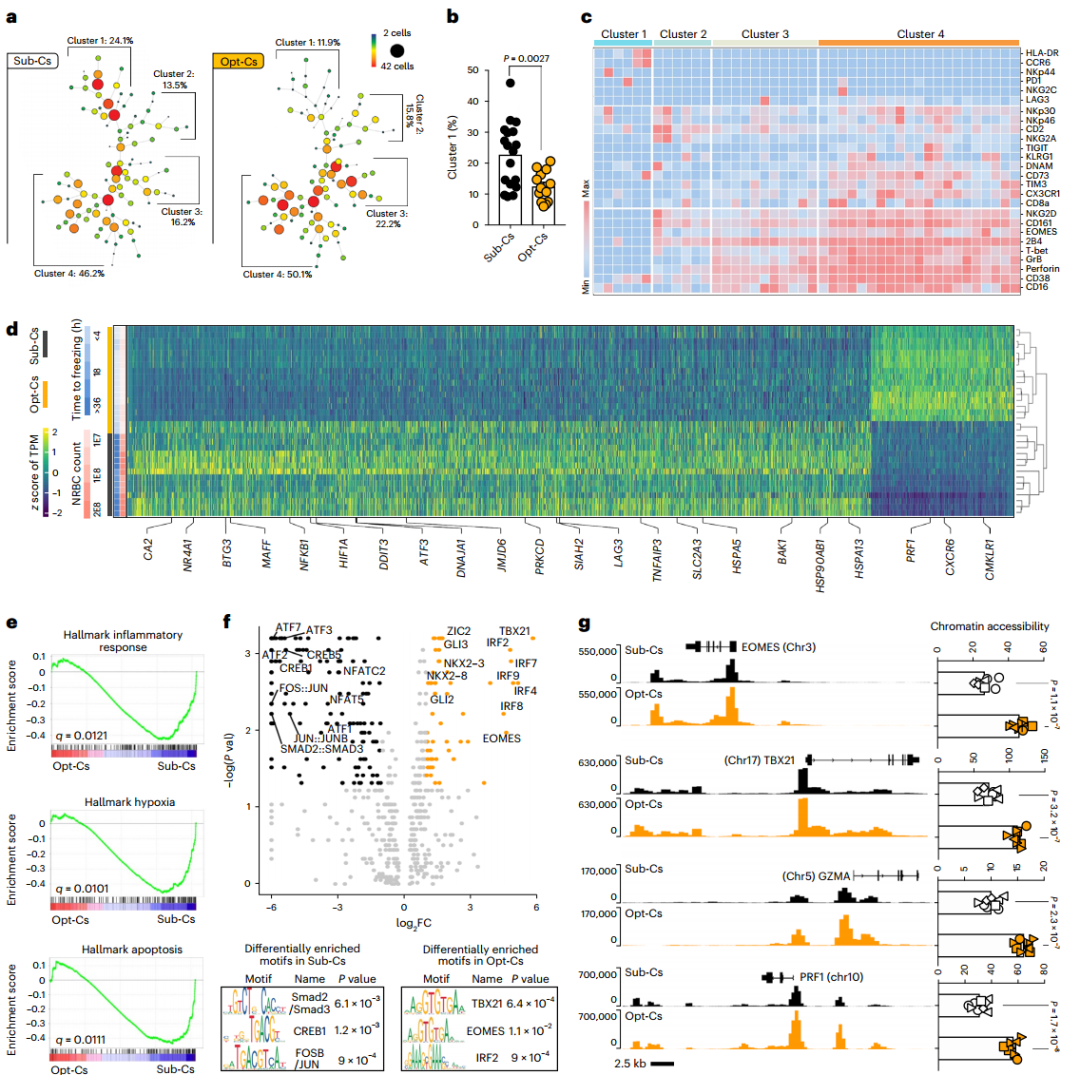 除此之外,该研究还探究了脐带血单位(CBU)特征是否会影响患者的结果。结果显示,接受有核红细胞≤8×107的CBU的CAR-NK细胞,收集到冷冻保存时间≤24小时是获得优异结果的最重要预测因素。从这些最佳CBUs中提取的NK细胞具有高功能,并富含效应相关基因。相比之下,来自次优CBUs的NK细胞具有炎症,缺氧和细胞应激程序的上调。研究团队进一步在淋巴瘤、多发性骨髓瘤和卵巢癌三种肿瘤小鼠模型中证实了来自最佳CBU的CAR/IL-15 NK细胞具有更好的体内增殖能力,从而实现了更好的肿瘤控制。这些发现揭示了CAR-NK细胞生物学的新特征,并强调了异体细胞疗法中供体选择的重要性。