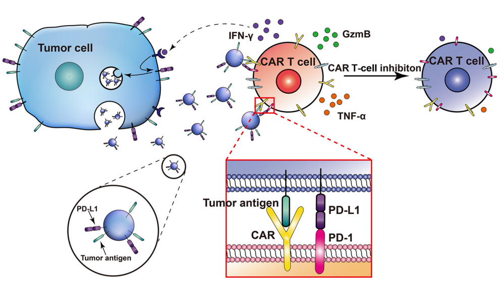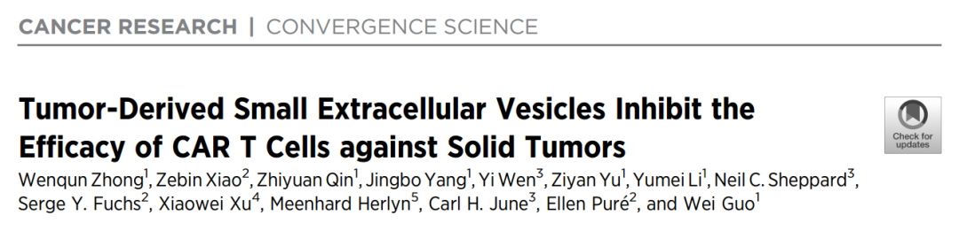 嵌合抗原受体T细胞(CAR-T)疗法在治疗造血肿瘤中显示出显著的疗效。然而,它们治疗实体瘤的效果不尽如人意。了解实体瘤免疫抑制微环境抑制CAR-T细胞浸润和功能的机制能帮助我们更好的攻破当前CAR-T细胞治疗实体瘤的局限性。细胞外囊泡(EV),如外泌体,是从细胞释放到细胞外环境的脂质包裹的囊泡。细胞外囊泡携带生物活性分子,并可能影响受体细胞的病理生理。最近一项发表在《Cancer Research》杂志上的新研究“Tumor-Derived Small Extracellular Vesicles Inhibit the Efficacy of CAR T Cells against Solid Tumors” 揭示了实体瘤分泌的小型细胞外囊泡与CAR-T细胞的相互作用与影响,提示了实体肿瘤抵抗CAR-T细胞的新机制。