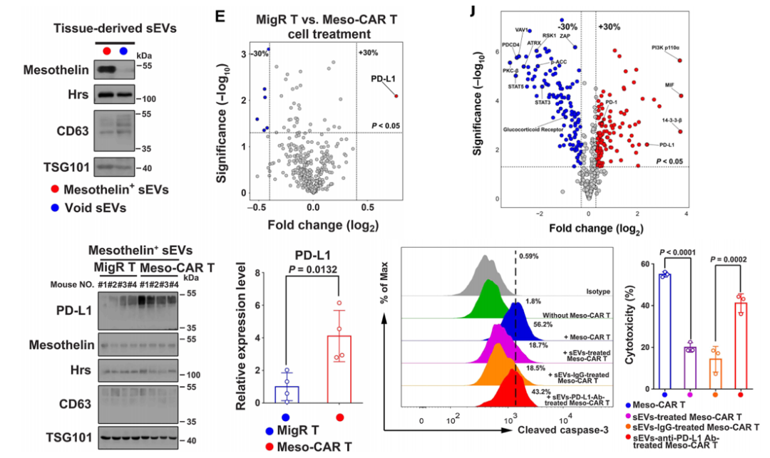 首先,作者利用小鼠脾T细胞,生成了靶向间皮素的Meso-CAR-T细胞,同时构建了小鼠肿瘤模型,并从肿瘤组织中纯化出小型细胞外囊泡。然后,作者使用基于抗体的定量蛋白质组学技术——逆相蛋白质阵列(RPPA)分析了其中蛋白质的表达。结果发现,在Meso-CAR-T细胞处理组中,PD-L1的水平明显更高。同时,RPPA分析发现CAR-T细胞中与T细胞活化相关的蛋白和T细胞存活相关的蛋白显著下调,而与T细胞衰竭相关的蛋白和调节性T细胞表达相关的蛋白被上调,这表明外泌体对CAR-T细胞具有抑制作用。作者在此进一步的证明了外泌体对CAR-T细胞毒性作用、增殖和功能的抑制作用。