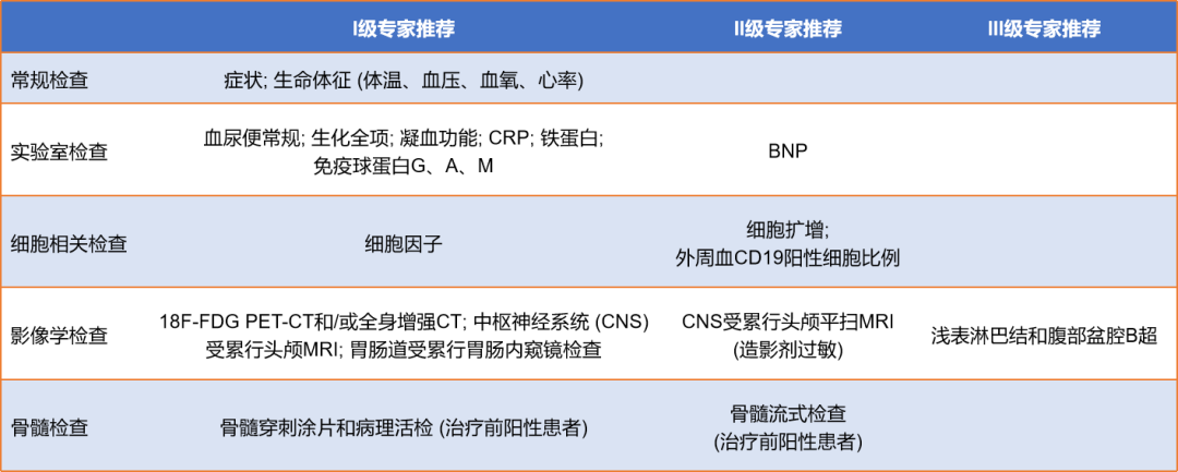 在CAR-T细胞回输后需对患者的生理指标进行密切监测以提前预测不良反应的发生,根据2022年的中国临床肿瘤学会 (CSCO) CAR-T细胞治疗恶性血液肿瘤及免疫靶向治疗相关感染管理指南,如图1所示,检查可以分为常规检查、实验室检查、细胞相关检查等五大类。