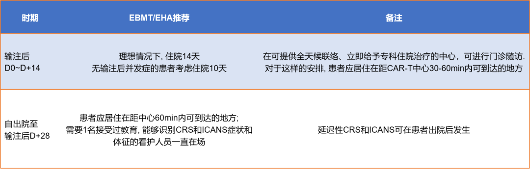 输注后的0-28天内患者的病情发展对治疗效果评价以及术后复发极为关键,欧洲血液与骨髓移植学会(EBMT)给出了便于进行观察和急救的住院及随访建议[1]。