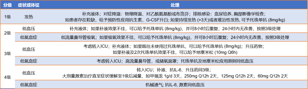 目前临床研究中用于CRS分级的方法有多种,参考美国卫生及公共卫生服务部提出的常见不良事件评价标准(common terminology criteria foradverse events,CTCAE) 4.0版的分级机制,共分为5级,不良反应逐级递增,5级即死亡。1-4分级标准如图4所示。