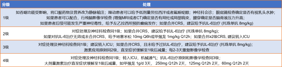 美国移植与细胞治疗学会(ASTCT)共识建议使用ARYOX-10筛选工具进行评估。同时将视盘水肿、颅内压、影像学诊断作为分级因素。参照Neelapu等提出的《CAR-T治疗相关毒性(10分)》评分系统及相关建议可以将 ICANS分为如图7所示的4个等级。