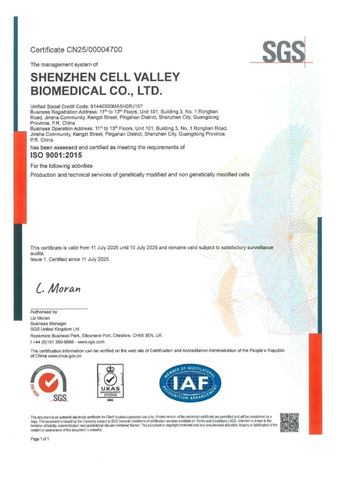 2025年7月11日,经国际权威认证机构SGS严格评审,深圳细胞谷生物医药有限公司正式获得ISO 9001:2015质量管理体系认证证书,认证范围覆盖基因修饰及非基因修饰细胞生产与技术服务。