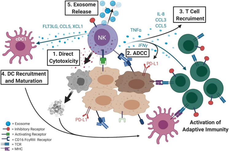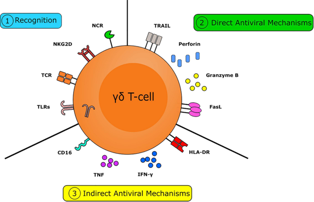 γδT细胞占T细胞群体的0.5%~5%,其TCR由γ链和δ链组成,主要存在于上皮和粘膜组织,比如皮肤、肠道等。γδT细胞和αβT细胞有共同之处,就是都可发挥细胞毒性效应(ADCC)功能、可产生促炎细胞因子。而最大区别在于,γδT细胞没有MHC的限制性,具备通用型细胞治疗产品的特质。γδT细胞可直接杀伤肿瘤细胞:迁移到肿瘤局部环境后,可通过穿孔素-颗粒酶途径溶解癌细胞;也可以通过配体TRAIL和FasL消灭癌细胞。γδT细胞也可间接杀伤肿瘤细胞:通过抗体依赖的细胞毒性作用(ADCC)靶向肿瘤细胞。γδT细胞是分泌细胞因子(IFN-γ和TNF-α等)重要的早期来源细胞。IFN-γ和TNF-α均通过多种机制抑制癌症的生长。γδT细胞还可分别通过与B细胞、DC细胞、αβT细胞和NK细胞相互作用而发挥其间接抗肿瘤作用。