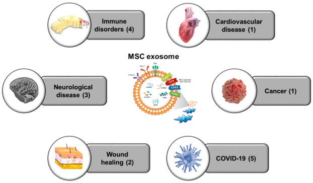 间充质干细胞源性外泌体(MSC-derived exosomes)是MSCs旁分泌作用的主要物质,也是目前研究和应用最广泛的外泌体之一。其包含与MSCs类似治疗性的生长因子及mRNA等生物活性物质,具有组织修复、免疫调节等疗效,同时又具备独特的优势,如:无自我复制能力,所以没有致瘤性;纳米级体积避免毛细血管截留,可以通过血脑屏障到达中枢神经系统损伤部位发挥生物学作用等。
