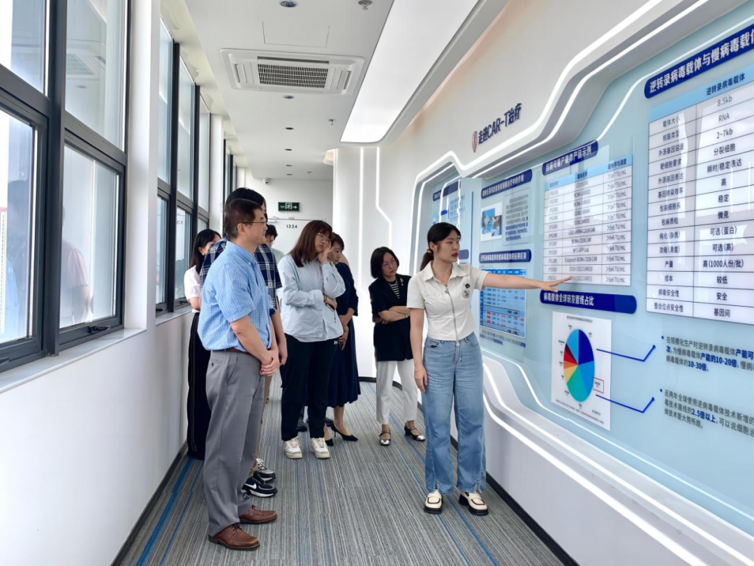陈涛教授一行在赵丽君部长的陪同下参观了智慧展厅,对深圳细胞谷的战略定位、创始人团队、发展历程概览以及核心技术专利概况有了初步了解。随后,通过实地参观我司的GMP级生产研发实验室以及质量管理实验室,深入探讨了我司在核心技术——逆转录病毒载体制备与细胞产品生产工艺上的独特竞争优势,并对质量管理方面所实施的全流程可追溯性严格监控体系表示了高度认可。