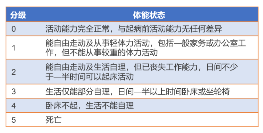 除此之外,临床上也常采用ECOG评分标准对患者进行体能状态评分。ECOG评分标准是一种用于评估恶性肿瘤患者体能状态和预后的重要工具[3]。它根据患者的活动能力和体力状况将评分分为六个等级,具体如下图三所示。评分越高,表示患者的体力状况越差。一般而言,评分在3级或以上的患者可能不适合接受化疗等治疗。其他的判定标准还包括淋巴瘤受累器官功能评估(如压迫、梗阻、溃疡出血等)和其他器官功能评估等。