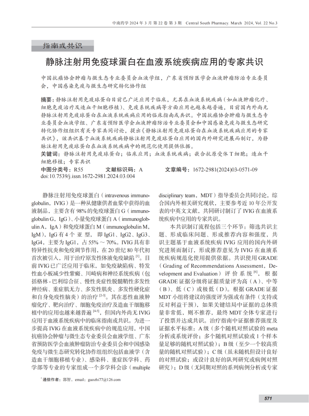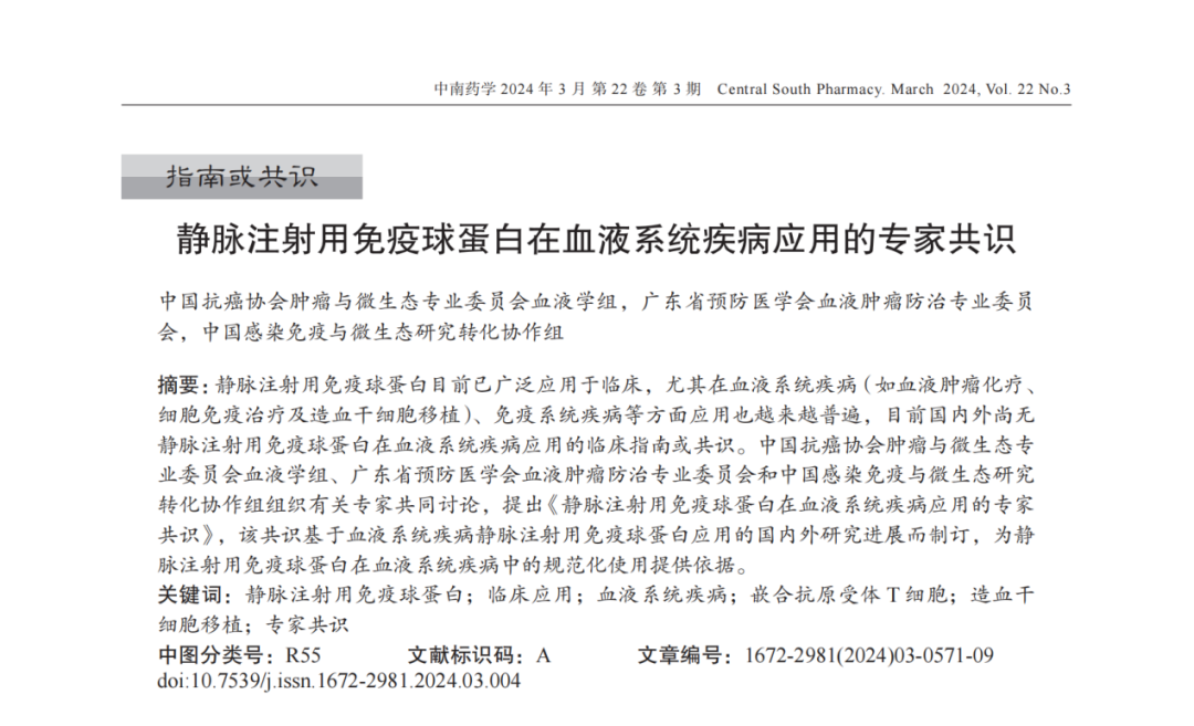 近日,由华中科技大学协和深圳医院郭智主任牵头,我司董事长史渊源教授参与,经中国抗癌协会肿瘤与微生态专业委员会血液学组、广东省预防医学会血液肿瘤防治专业委员会以及中国感染免疫与微生态研究转化协作组的专家们的深入研讨,在国家核心期刊“中南药学”上发表了题为《静脉注射用免疫球蛋白在血液系统疾病应用的专家共识》的文章。该共识基于国内外关于血液系统疾病中静脉注射用免疫球蛋白应用的研究进展而制定,旨在为规范化使用静脉注射用免疫球蛋白在血液系统疾病中提供有力依据。