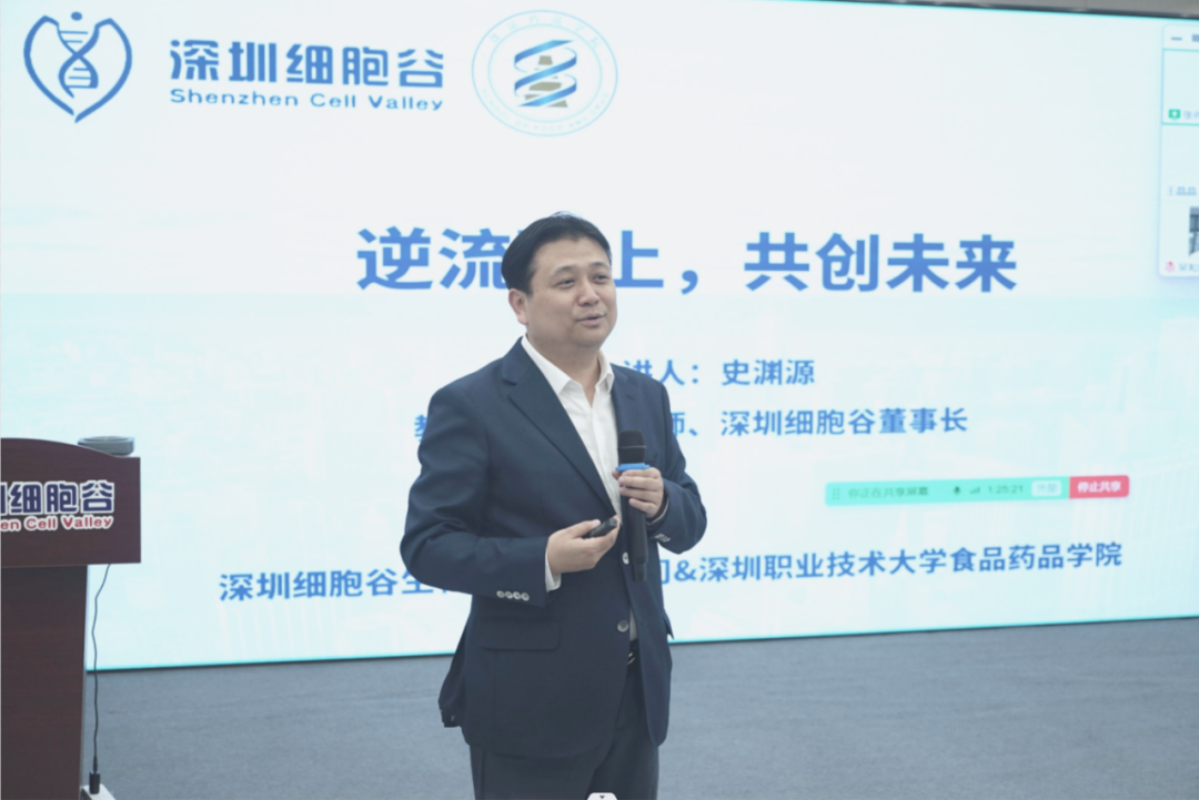 交流会上,我司董事长史渊源教授对三十余位深职大食药学院的领导、师生们表示热烈欢迎,并开展《逆流而上,共创未来》为主题的演讲。史渊源教授介绍了细胞与基因治疗的行业发展趋势、企业战略布局和定位、生产研发方面的重大突破,并表示深圳细胞谷将发挥在细胞与基因治疗领域核心且先进的技术优势,运用成熟的定向人才培养模式,持续深化与深圳职业技术大学在产学融合等方面的交流与合作,协同探索更多的交叉创新点,加速细胞与基因治疗行业的人才培育,并秉承“不忘初心、治病救人”的理念,与深圳职业技术大学师生携手打造行业新业态。