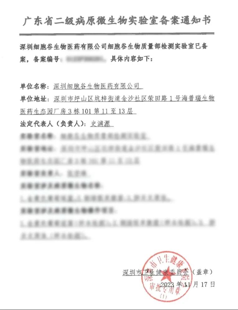 深圳细胞谷及全资子公司君厚生物双双通过生物安全P2实验室备案