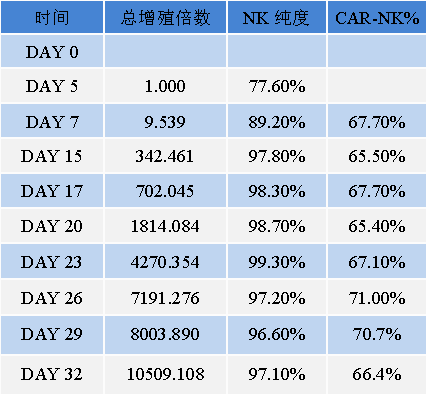 运用深圳细胞谷独有的PackRV-SS系统生产的逆转录病毒载体转导NK细胞技术,其转导效率稳定在60%以上,且阳性率一直保持稳定;而且CAR-NK细胞在转导后培养的30天内增殖可达10000倍。