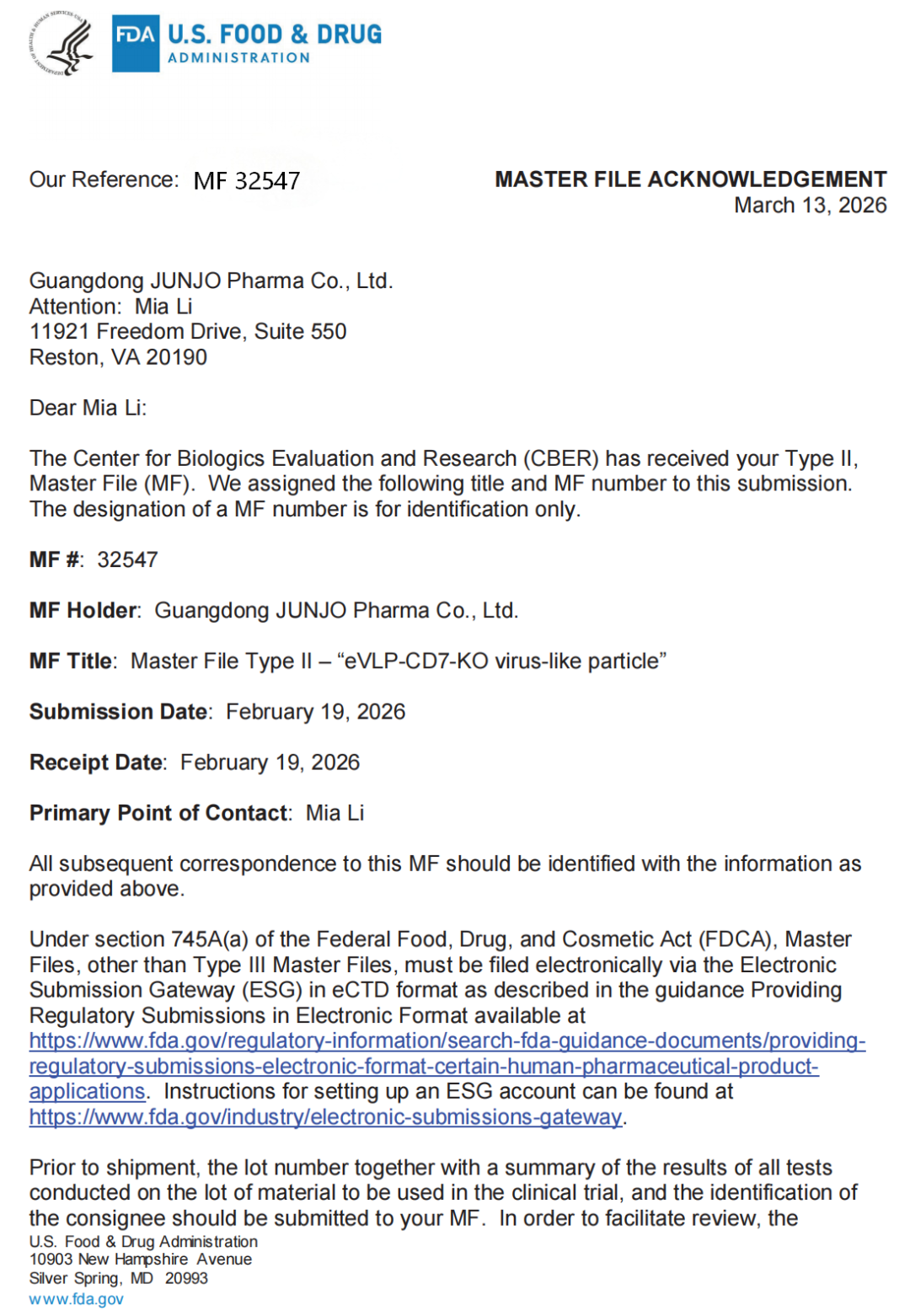 近日,细胞谷集团在细胞与基因治疗核心技术国际化方面取得重要里程碑进展。集团全资子公司广东君厚生物医药有限公司自主研发的 “eVLP-CD7-KO virus-like particle(CD7基因敲除工程化类病毒颗粒)” 已正式完成美国食品药品监督管理局(FDA)Drug Master File(DMF)备案,备案号 MF 32547,并获得美国 FDA 生物制品评估与研究中心(CBER)受理确认。