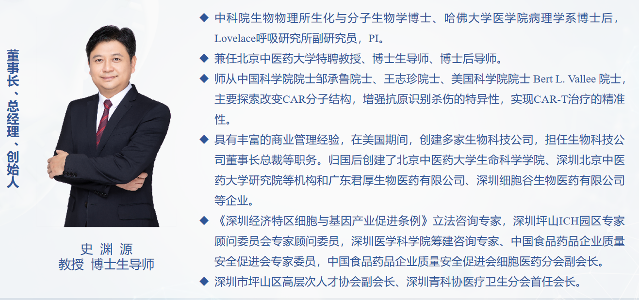 深圳细胞谷由来自美国哈佛大学和加州大学圣迭戈分校的海归科学家联合创办。管理团队来自在美国著名商学院毕业和生物医药科技公司担任高管的精英。公司拥有多名生物医学专家,以及在国际知名企业开展 GMP 级别病毒载体和 CAR-T 生产经验的顶尖人才。