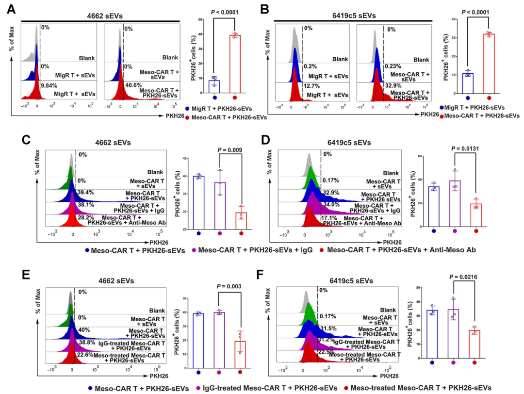 随后,作者研究了肿瘤抗原是否参与肿瘤源性外泌体与CAR-T细胞的关联。结果发现,肿瘤源性外泌体与Meso-CAR-T细胞的结合水平明显高于对照,用抗间皮素抗体预处理外泌体可显著抑制其结合。这些数据表明,外泌体上的抗原与它们匹配的CAR相互作用,这使得外泌体与CAR-T细胞优先结合。间皮素外泌体对Meso-CAR-T细胞的抑制作用明显更强,抗间皮素抗体显著减弱了外泌体对肿瘤杀伤、增殖和功能的抑制作用。总的来说,CAR-T靶向抗原介导的相互作用增强了外泌体对实体瘤中CAR-T细胞的抑制作用。体内实验也表明间皮素是肿瘤外泌体介导的Meso-CAR-T细胞体内抑制的关键所在。